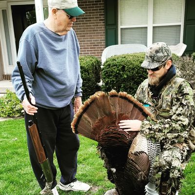 We reached the starting place where the timber met the pasture where we went in. Low and behold, there was a flock of 6 Jakes and 2 hens. We hid behind a monster of an oak tree until they slipped into the timber. We set down up against that oak positioning my father at the area they went into the woods, with myself beside him, just off his shoulder. I began to call to the Jakes. It didn't take much to have the entire flock come running out of the timber, right back to the spot we saw them at. "Pick one, put the bead on his head and squeeze, then give me the gun." I told him. A short moment later, he picked one out and pulled the trigger. Little did he, or I, know had the gun too high on his shoulder. When the round went off, it sent the 12 gauge right off his shoulder, into my lap. I picked it up and shot the closest Jake to me on the run. Not only did he bag his first turkey, but we were able to double up on birds. It might have just been jakes, but that was a hunt I will forever remember.